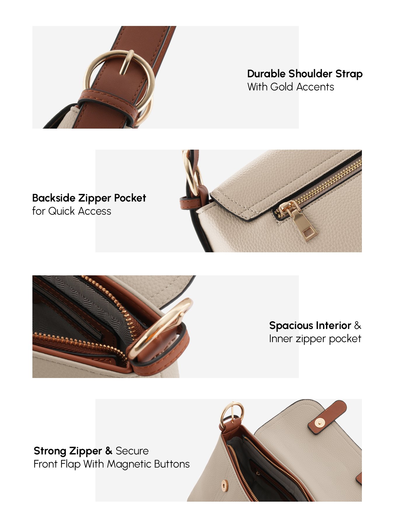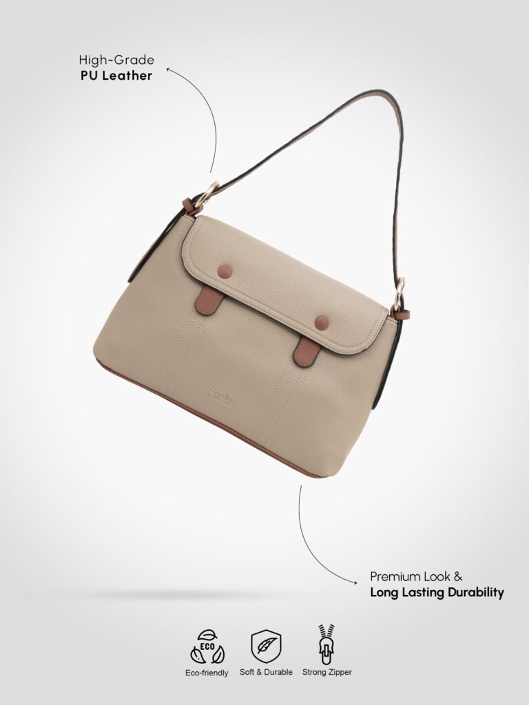 Design: Features a classic tan/beige color with contrasting brown accents and a front flap with a secure magnetic or snap button closure to keep your belongings safe.