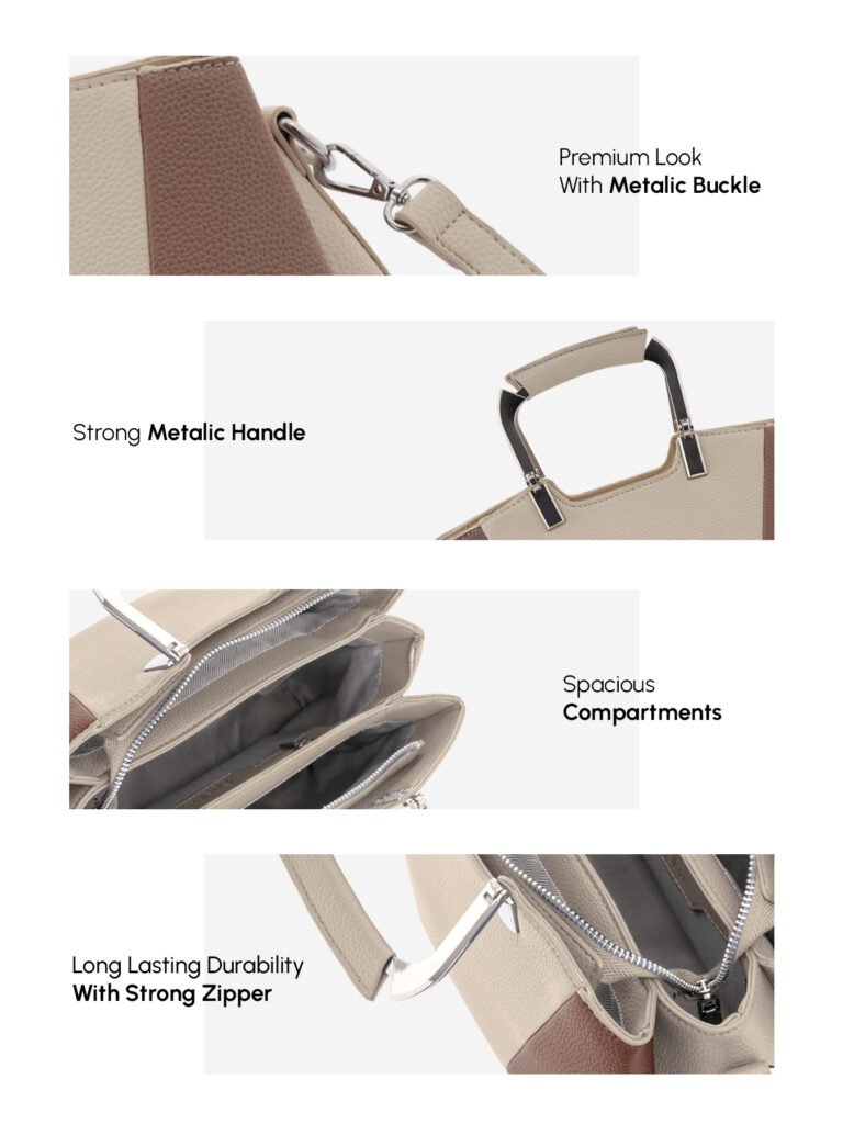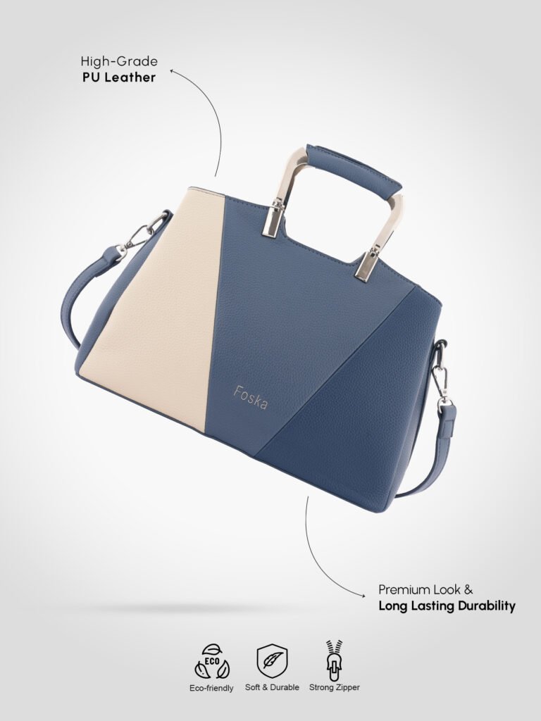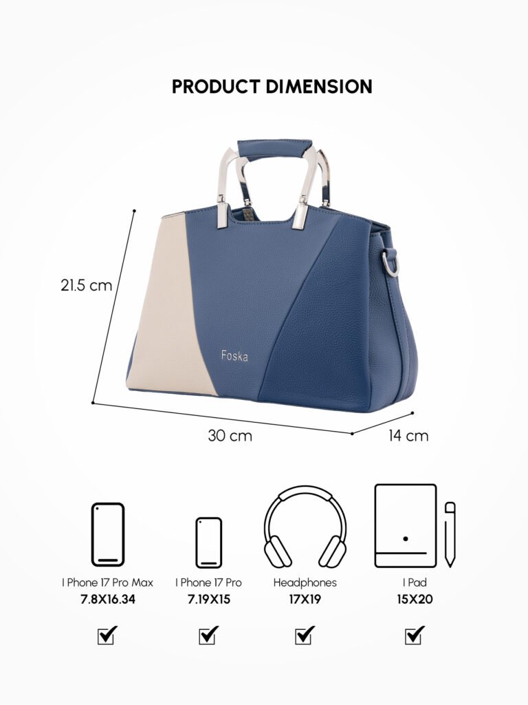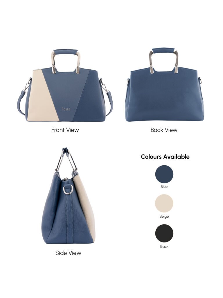 Design: Features a distinctive two-tone, color-block design with a structured silhouette in rich navy blue and light beige. It is accented with sleek, modern silver-tone top handles and hardware.